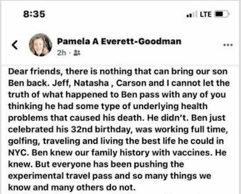 Mr. Benjamin Goodman went to a Walgreens pop-up COVID-19 “vaccine” clinic in Chelsea, New York on Saturday, March 13. He received the experimental Johnson & Johnson viral vector shot, according to his stepmother Pamela Goodman. Benjamin texted his father, Jeff Goodman, and told him he received the shot. The family was not happy to hear the news. Soon thereafter, Benjamin had a severe headache and started feeling ill. He fell asleep, hoping the symptoms would pass after some rest.