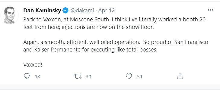 He was proud to receive an experimental COVID shot in San Francisco from Kaiser Permanente on April 12, 2021.