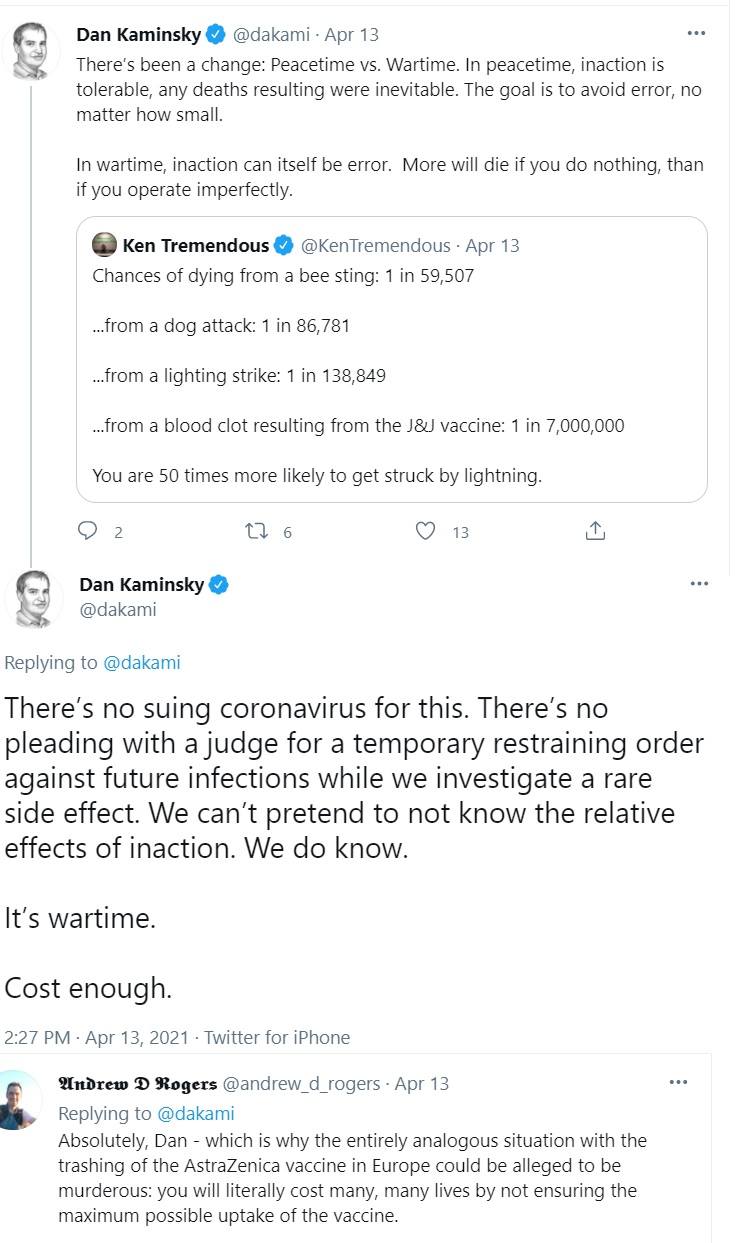 The next day he tweeted his displeasure that the J&J and AstraZeneca shots had been halted due to fatal blood clots, expressing his belief that people would die as a result of the shots being halted, and that one was more likely to die by being struck from lightning than from a rare side effect from a COVID injection.