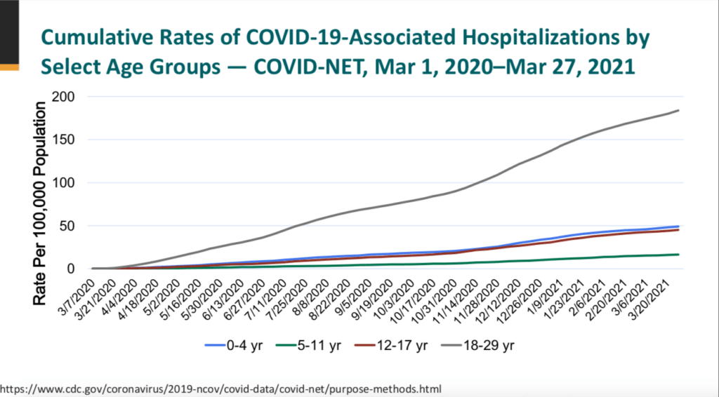 This is an age group that does not tend to be susceptible to severe infection, and CDC says from March of 2020 through April 2021, those aged 12-17 made up just 9% of the reported cases, and very few of the hospitalizations. As with adults, children with underlying health issues are more at risk. Most children experience low to no symptoms and likely develop long-lasting robust immunity.