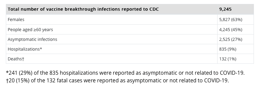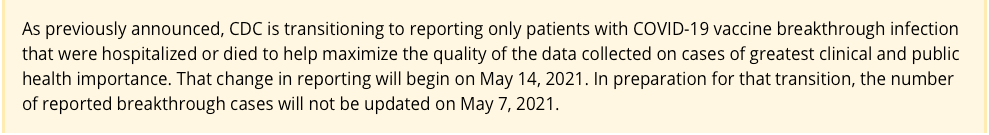 “It is important to note that reported vaccine breakthrough cases will represent an undercount. This surveillance system is passive and relies on voluntary reporting from state health departments which may not be complete.  Also, not all real-world breakthrough cases will be identified because of lack of testing. This is particularly true in instances of asymptomatic or mild illness. These surveillance data are a snapshot and help identify patterns and look for signals among vaccine breakthrough cases.”