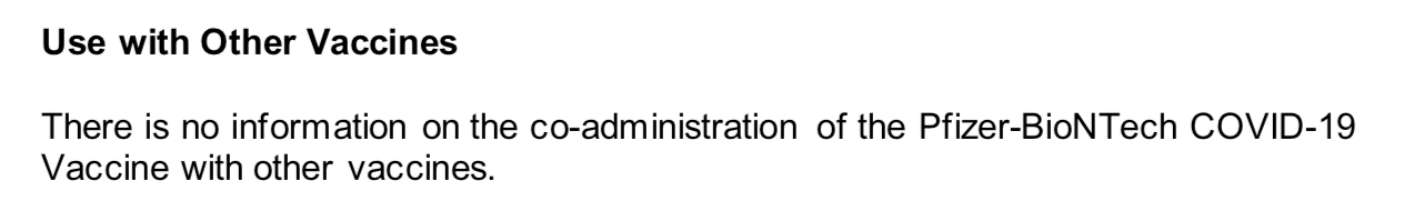 Not a single clinical trial has been done administering the COVID-19 shots with any other vaccine. There is zero safety data. The Pfizer EUA Fact Sheet states: