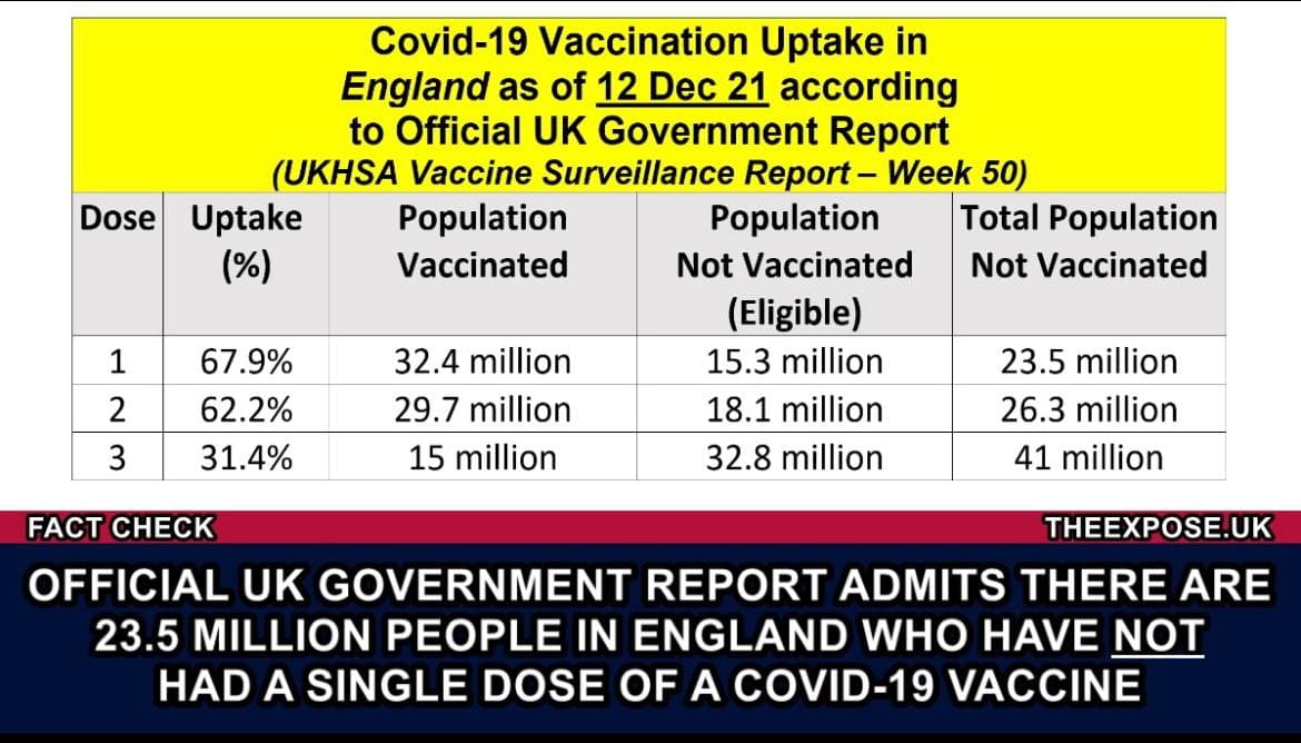 It is a complete fabrication that has no doubt been used to make those who have refused the jab feel as if they are part of a minority, because an official UK Government report proves that in England alone there are approximately 23.5 million people who have not had a single dose of a Covid-19 vaccine.