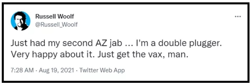 Woolf tweeted on August 19th that he had just received his second dose of the AstraZeneca COVID-19 vaccine: