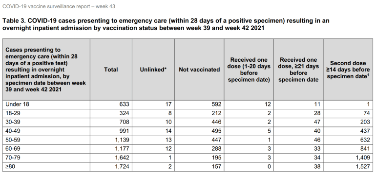 Table 3 of the report shows that the number of people presenting to emergency care with Covid-19 resulting in overnight inpatient admission who were not-vaccinated was 2,832, whilst a further 305 were partly vaccinated, and 5,124 were fully vaccinated.