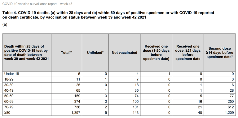 Table 4 of the report shows the number of people to have died within 28 days of a positive test result for Covid-19 who were not vaccinated was just 487, whilst a further 88 were partly vaccinated, but a shocking 2,185 were fully vaccinated.
