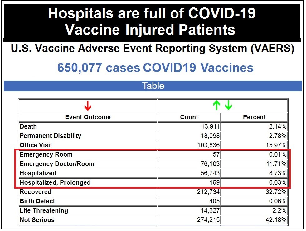 This is evident from the last release of data into the government Vaccine Adverse Event Reporting System (VAERS) database, which as of last Friday shows that following COVID-19 shots, there have been 13,911 deaths, 18,098 permanent disabilities, 76,160 ER visits, 56,912 hospitalizations, 2,933,377 injury symptoms, and 14,327 life threatening events.