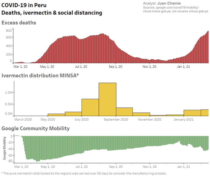 But if that happens, the result is likely to be a lot more deaths. Peru, the first country to use ivermectin against Covid, is living proof of that. The medicine was first used in eight states during the very early stages of the pandemic (May-July). After showing promise, it was extended to the whole country. Excess deaths dropped 59% (25%) at +30 days and 75% (25%) at +45 days after day of peak deaths. But in October, after the first wave had been brought under control, a newly elected government in Lima took the inexplicable step of withdrawing a number of medicines, including ivermectin, from its treatment guide for the disease.