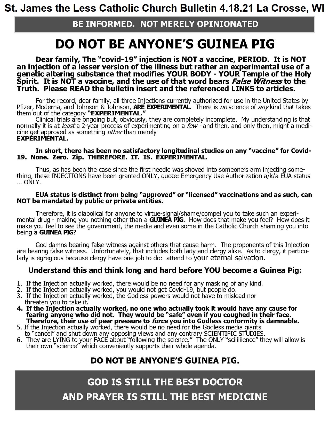 Here’s another page from his church bulletin that pretty much sums up what he thinks of those in the clergy promoting the COVID shots and other measures: