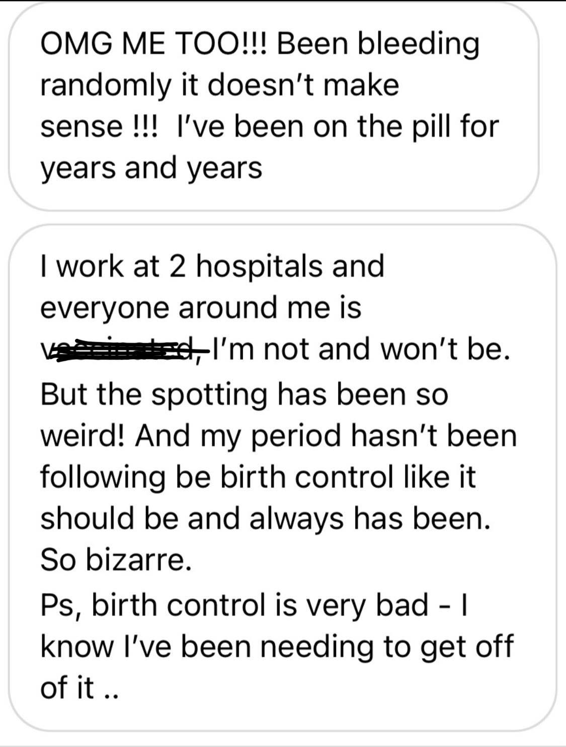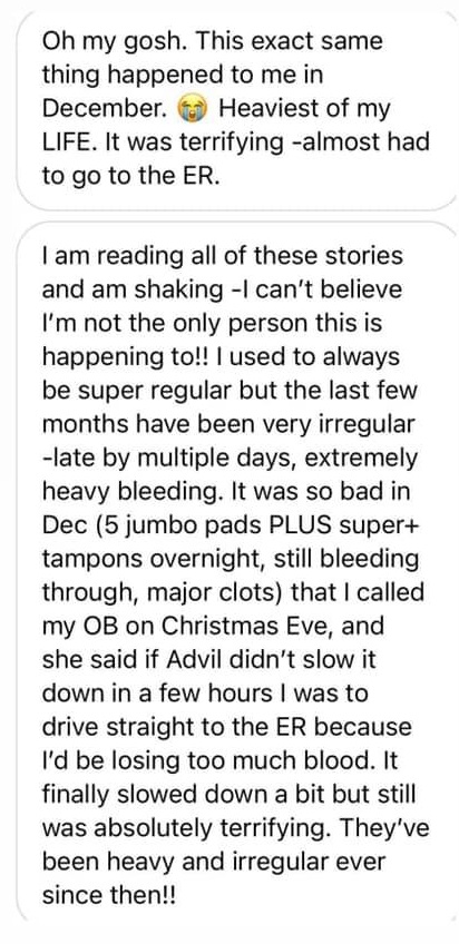 These women (and many men sharing experiences of wives, girlfriends or women they know), include bleeding, hemorrhaging, passing clots, delayed cycle, prolonged cycle, bleeding POST menopause, miscarriages, decidual casts, severe period cramping and abnormal pain, etc. The list is VAST and the influx of testimonies have been eye opening…