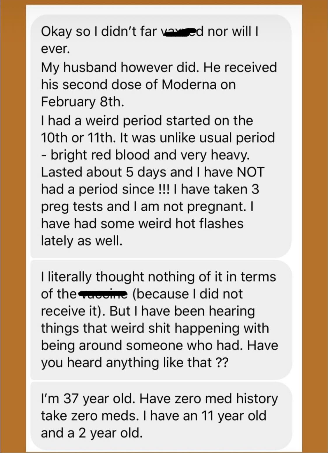 But another phenomena is being reported: these symptoms are being reported among women who did NOT get the injections also, but have been around those who have.