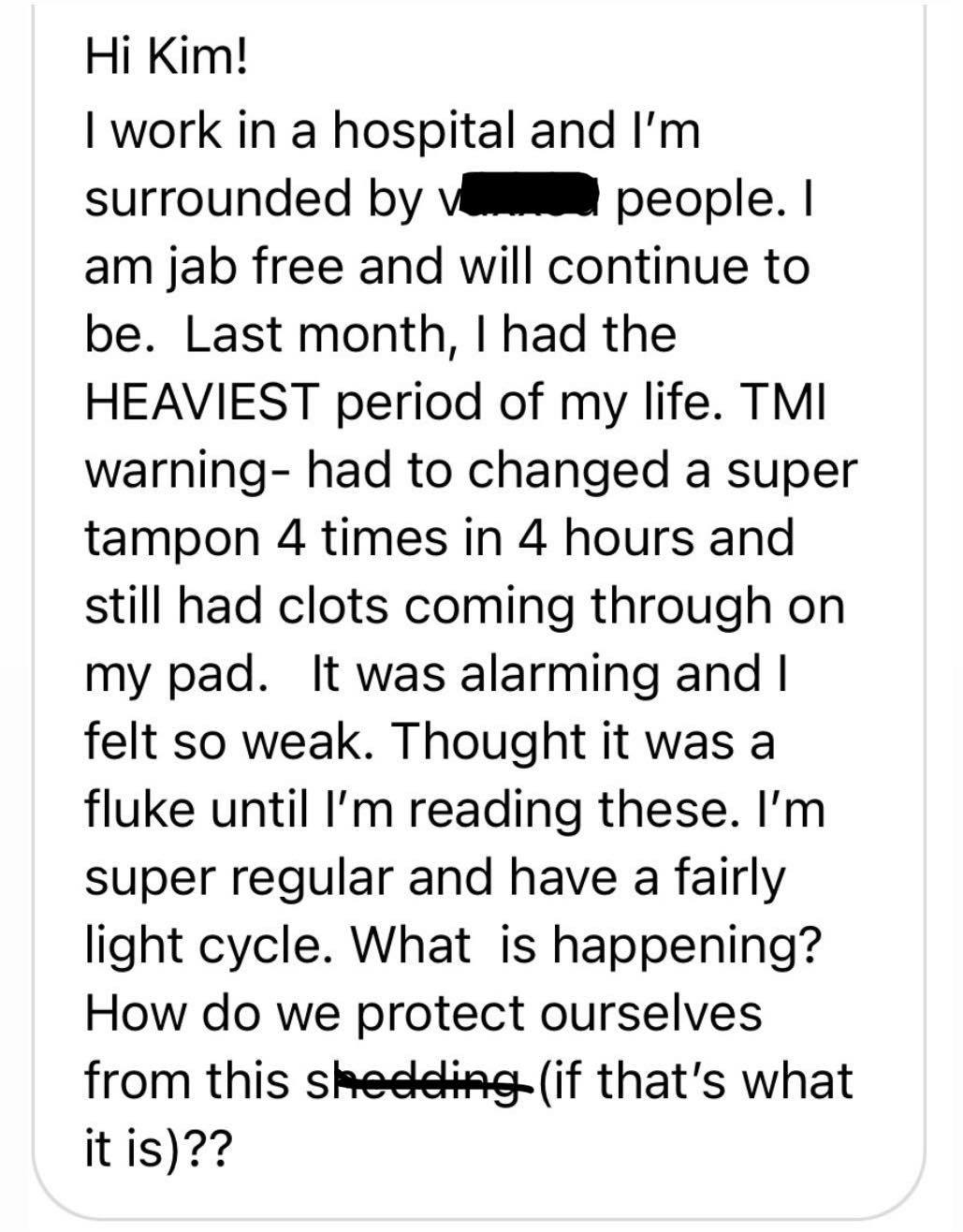 ‘I’m curious whether other menstruators have noticed changes too? I’m a week and a half out from dose 1 of Moderna, got my period maybe a day or so early, and am gushing like I’m in my 20s again.