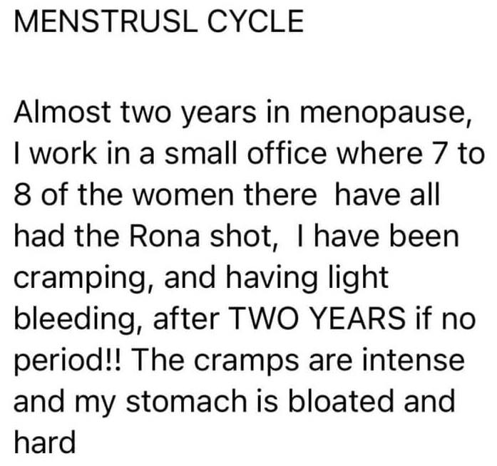 Severe cramping, heavy bleeding for days on end, post-menopausal women all of a sudden menstruating again, irregular periods, and more are all being reported by women after being injected with a COVID experimental shot.