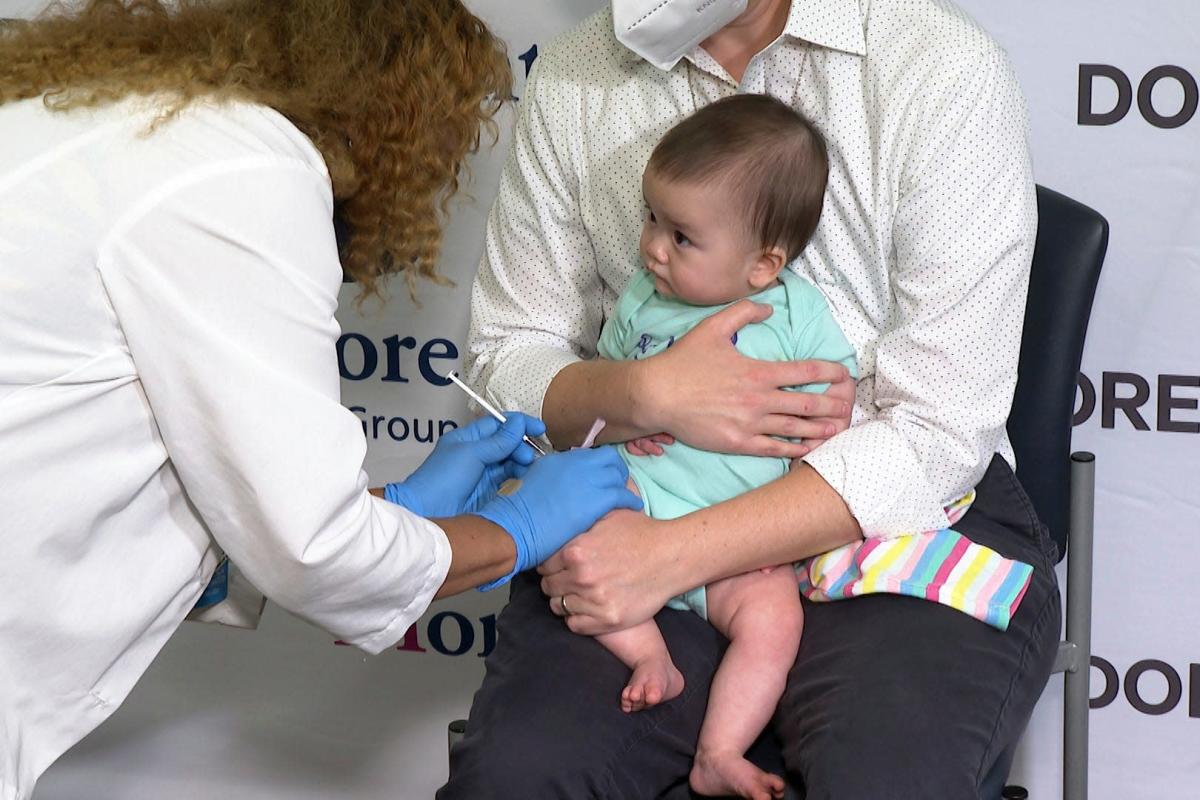 Ellen Fraint holds her daughter, seven-month-old Jojo, as she receives the first dose of the Moderna COVID-19 vaccine for children at Montefiore Medical Group in the Bronx borough of New York City on Tuesday June 21, 2022. Source.