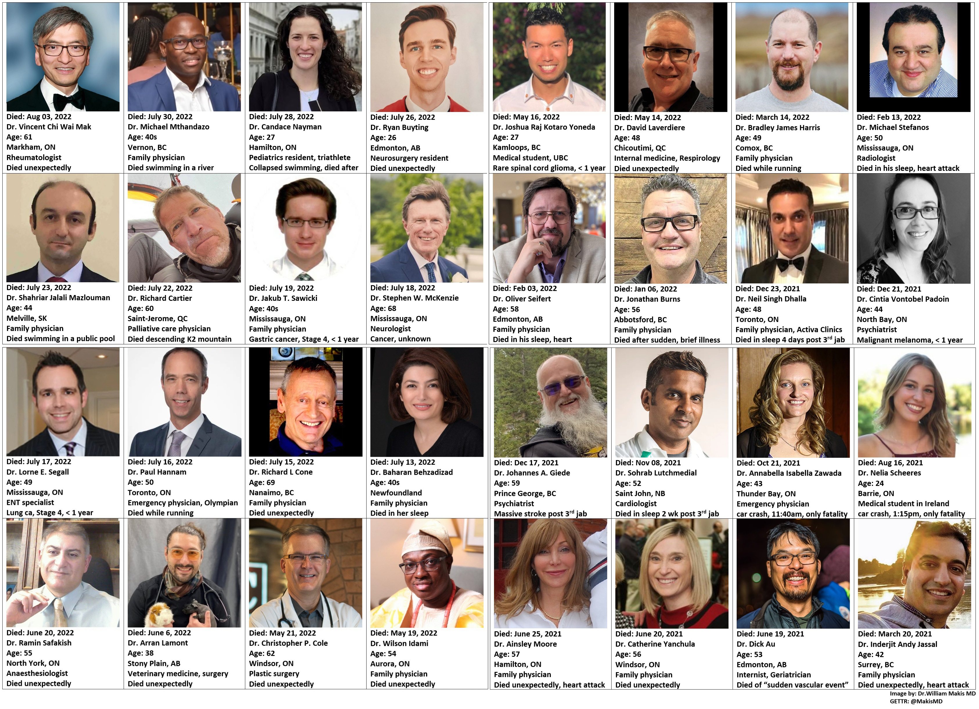 On July 30, 2022 we published an article documenting how 6 Canadian doctors had died within 2 weeks of each other, shortly after some hospitals in Canada mandated a 4th COVID booster shot. See: