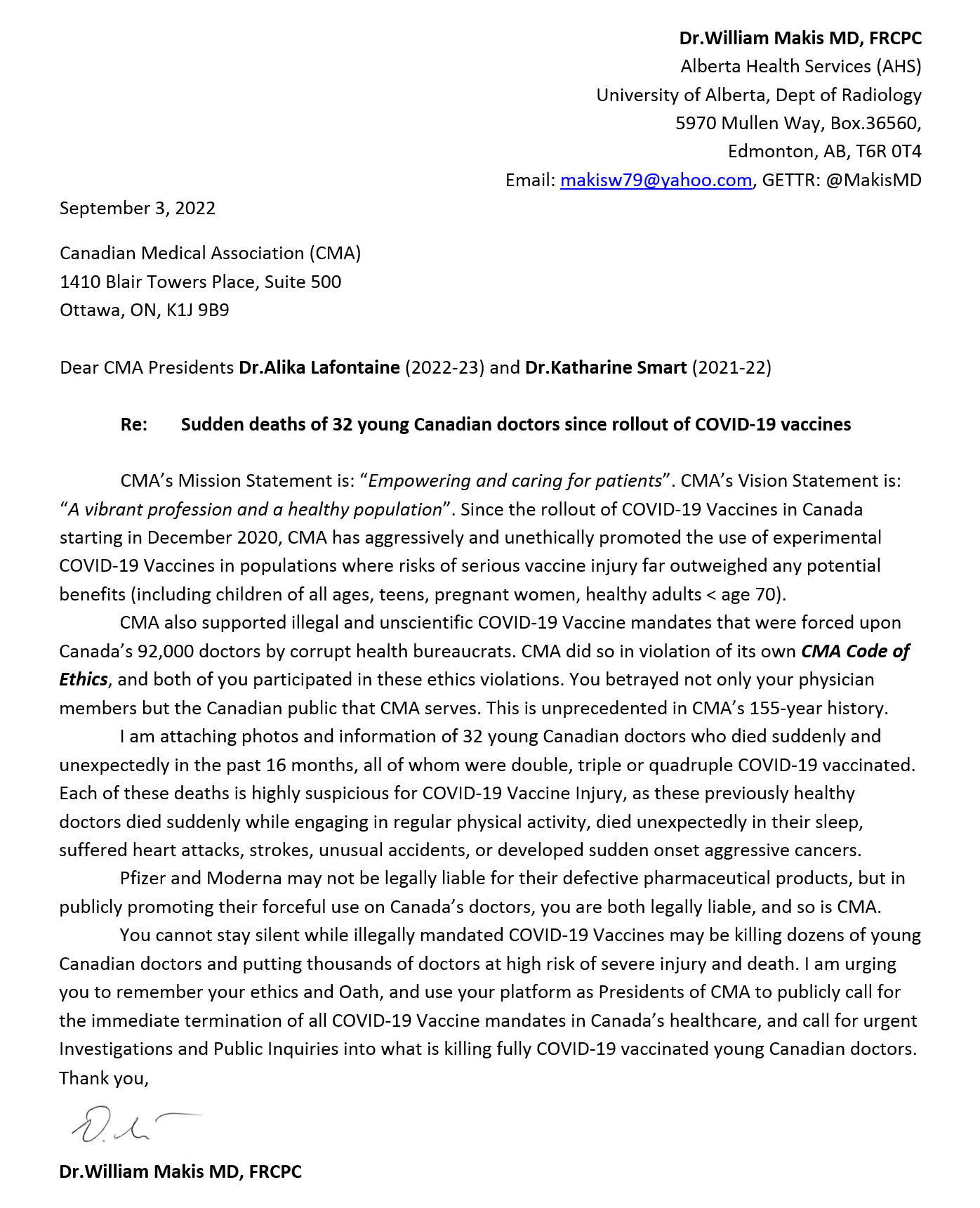 I’ve sent a letter to Canadian Medical Association (CMA) Presidents Dr.Alika Lafontaine & Dr.Katharine Smart, both of whom supported COVID-19 Vaccine mandates on all of Canada’s 92,000 doctors and I urged them to call for IMMEDIATE termination of all COVID-19 Vaccine mandates in Canada’s healthcare, as well as Investigations & Public Inquiries into these sudden deaths. CMA cannot continue to ignore this catastrophe. Please circulate!