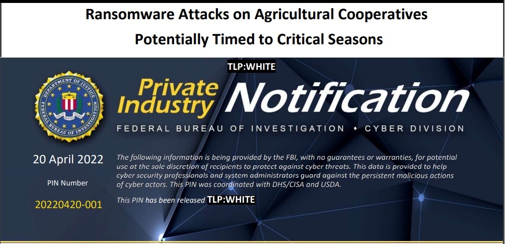 The Federal Bureau of Investigation (FBI) is informing Food and Agriculture (FA) sector partners that ransomware actors may be more likely to attack agricultural cooperatives during critical planting and harvest seasons, disrupting operations, causing financial loss, and negatively impacting the food supply chain. The FBI noted ransomware attacks during these seasons against six grain cooperatives during the fall 2021 harvest and two attacks in early 2022 that could impact the planting season by disrupting the supply of seeds and fertilizer. Cyber actors may perceive cooperatives as lucrative targets with a willingness to pay due to the timesensitive role they play in agricultural production. Although ransomware attacks against the entire farm-to-table spectrum of the FA sector occur on a regular basis, the number of cyber attacks against agricultural cooperatives during key seasons is notable.