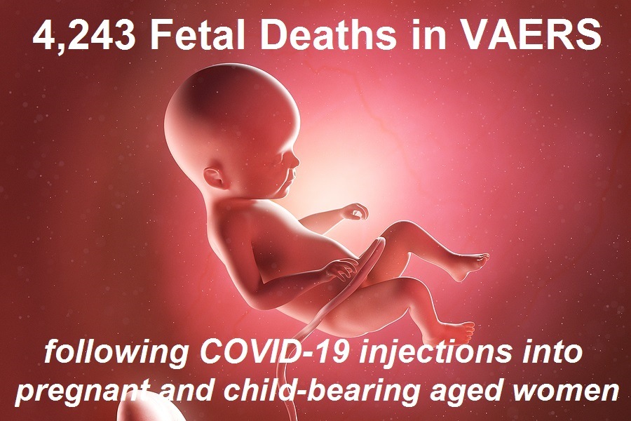 Through yesterday’s update of VAERS, there are now 4,243 cases of fetal deaths recorded following COVID-19 vaccines injected into pregnant and child-bearing aged women. (Source.)