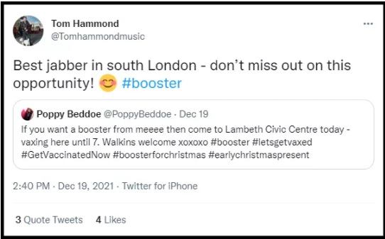 Fellow musician Poppy Beddou, who administers COVID shots at a Brixton Customer Centre, tweeted on December 19th:
