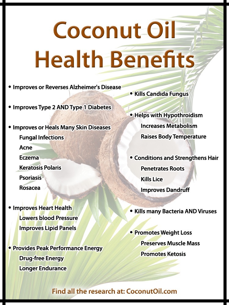 Here is an image we have used for years, and that actually needs to be updated to include more recent research, showing the many health benefits of coconut oil: