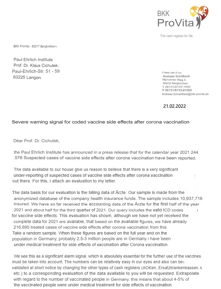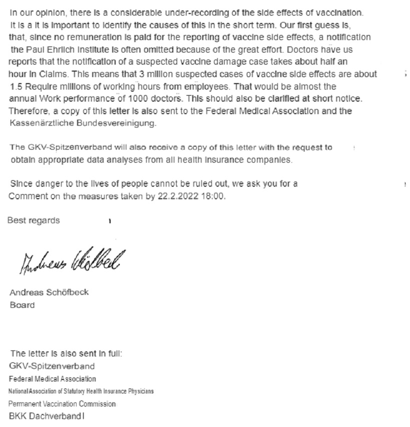 Disclose.tv also covered it on their Twitter account, where they translated a letter sent by Andreas Schöfbeck, the German health insurance BKK board member, to the Paul-Ehrlich Institute, an agency of the German Federal Ministry of Health.