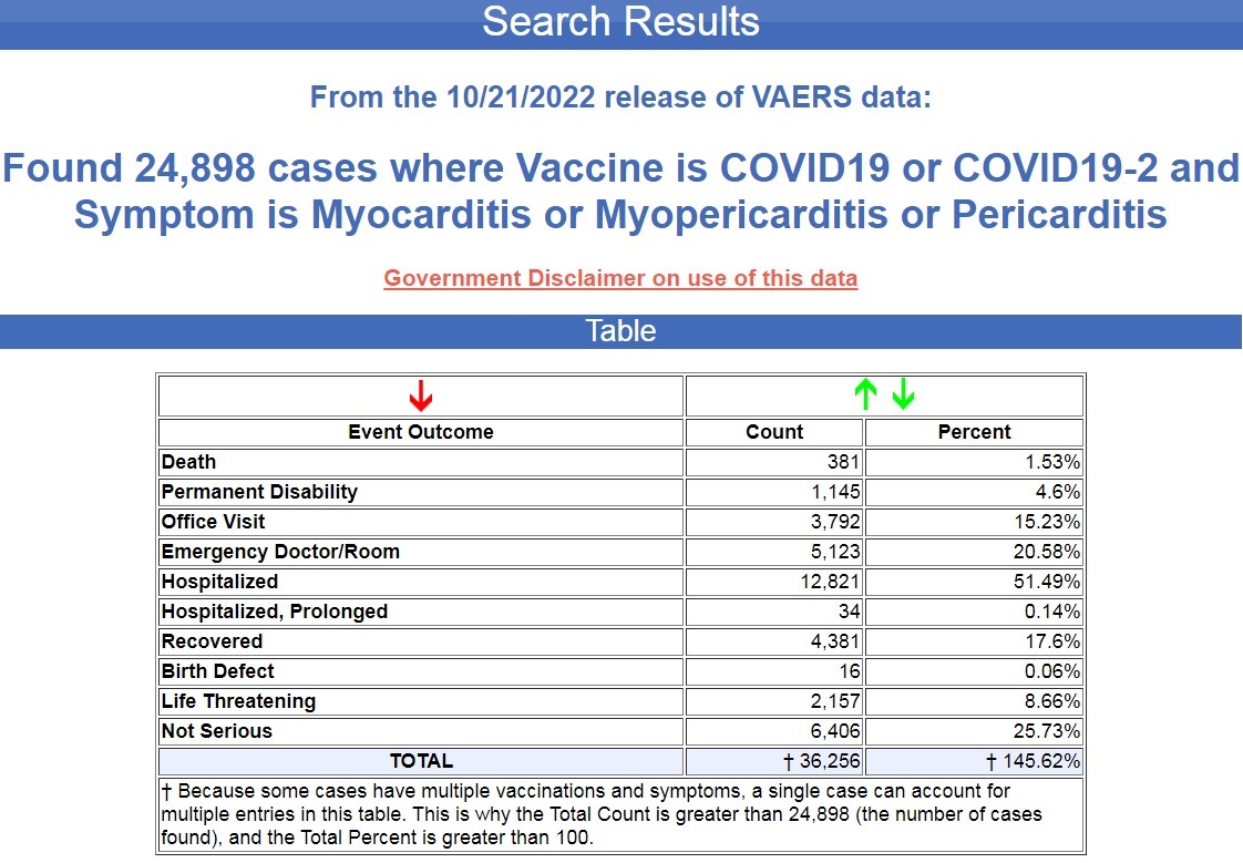 I took the three forms of heart disease that JAHA referenced, which are myocarditis, pericarditis, and myopericarditis, and searched for these three forms in VAERS following COVID-19 vaccines. The search found almost 25,000 cases, with 381 deaths, 1,145 permanent disabilities, over 5000 ER visits, and nearly 13,000 hospitalizations. (Source.)