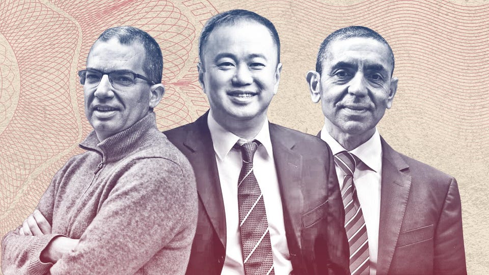 New Plandemic Billionaires: Stephane Bancel (left), CEO of Moderna, a company that had never distributed a vaccine prior to their COVID-19 mRNA vaccine, Liu Fangyi (center), founder and chairman of Intco Medical, a manufacturer of personal protective equipment including gloves, face masks, isolation gowns and hand sanitizer. California alone sent $1BILLION of U.S. COVID taxpayer funds to China in 2020 for face masks.  Uğur Şahin (right), the CEO and cofounder of BioNTech, which he started alongside his wife and chief medical officer Özlem Türeci. BioNTech partnered with Pfizer to make the first vaccine authorized by regulators in the U.S., under pressure by then President Donald Trump, on December 11, 2020. Image Source by Forbes.