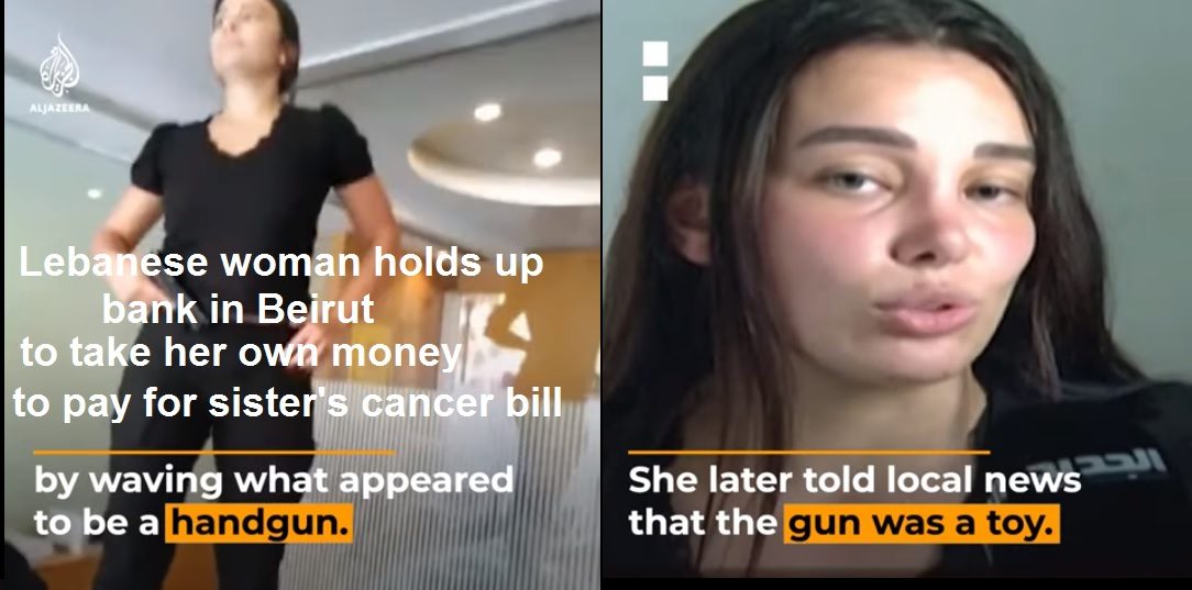 - On the same day, a woman called Sali Hafiz entered a BLOM Bank branch in Beirut with what she later said was a toy gun, along with other activists, in order to retrieve money from her own account to fund hospital treatment for her cancer-stricken sister. She poured gasoline inside the branch and threatened to set it on fire if she did not receive her savings.