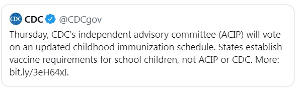 And as you can read from the official Press Release I just quoted above, the CDC reiterated this after the recommendation: “school-entry vaccination requirements are determined by state or local jurisdictions.”