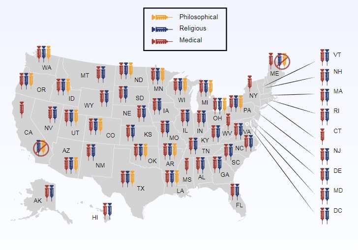 Here is the current map, provided by the National Vaccine Information Center (NVIC), that shows the exemptions for childhood vaccines available in each state.