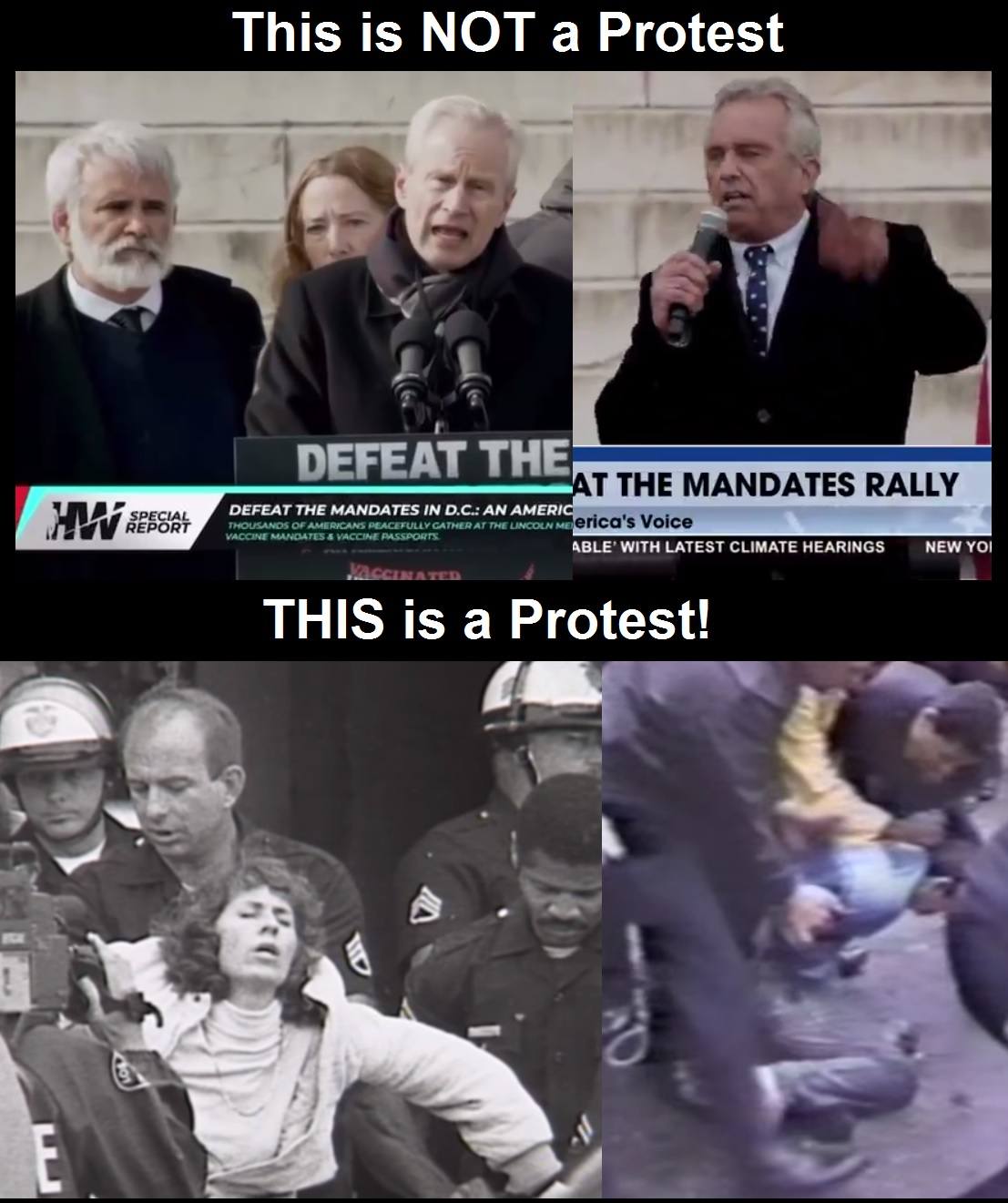 Top photos from the recent “Defeat the Mandates” rally in Washington D.C. Bottom photos from the “Operation Rescue” movement in the late 1980s and early 1990s.