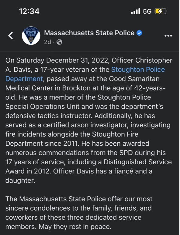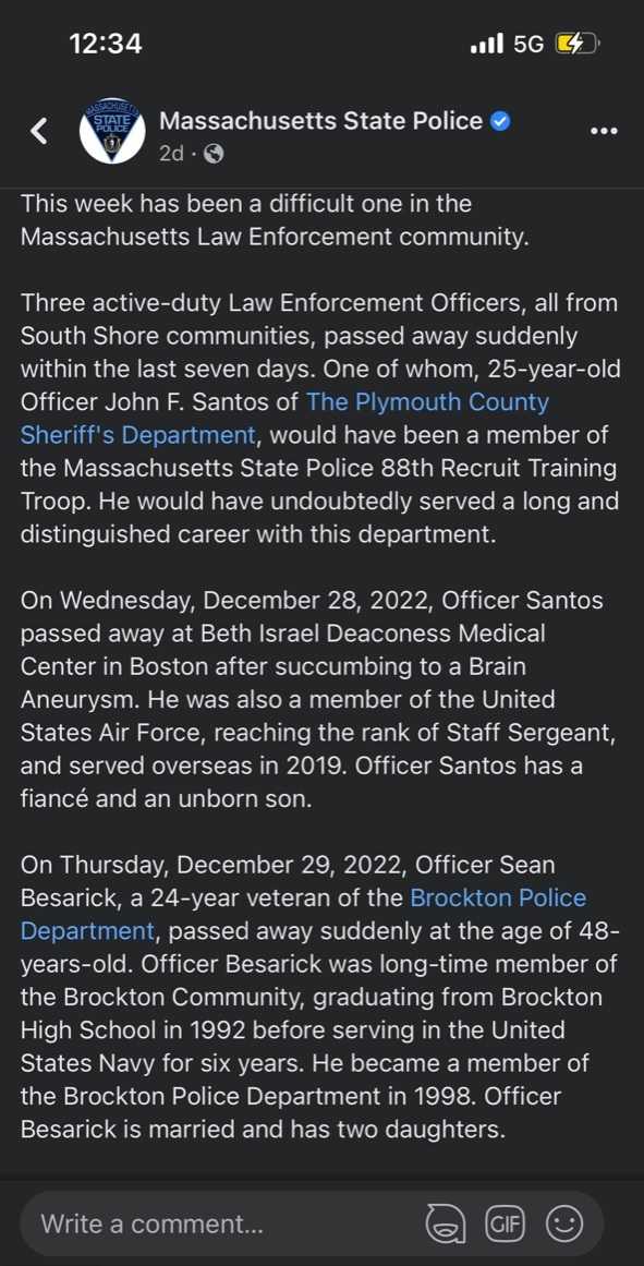This past week, the Massachusetts State Police announced the death of 3 of their law enforcement officers: Officer John F. Santos (25) of The Plymouth County Sheriff’s Department, Officer Sean Besarick (48) of the Brockton Police Department, and Officer Christopher A. Davis (42) of the Stoughton Police Department.