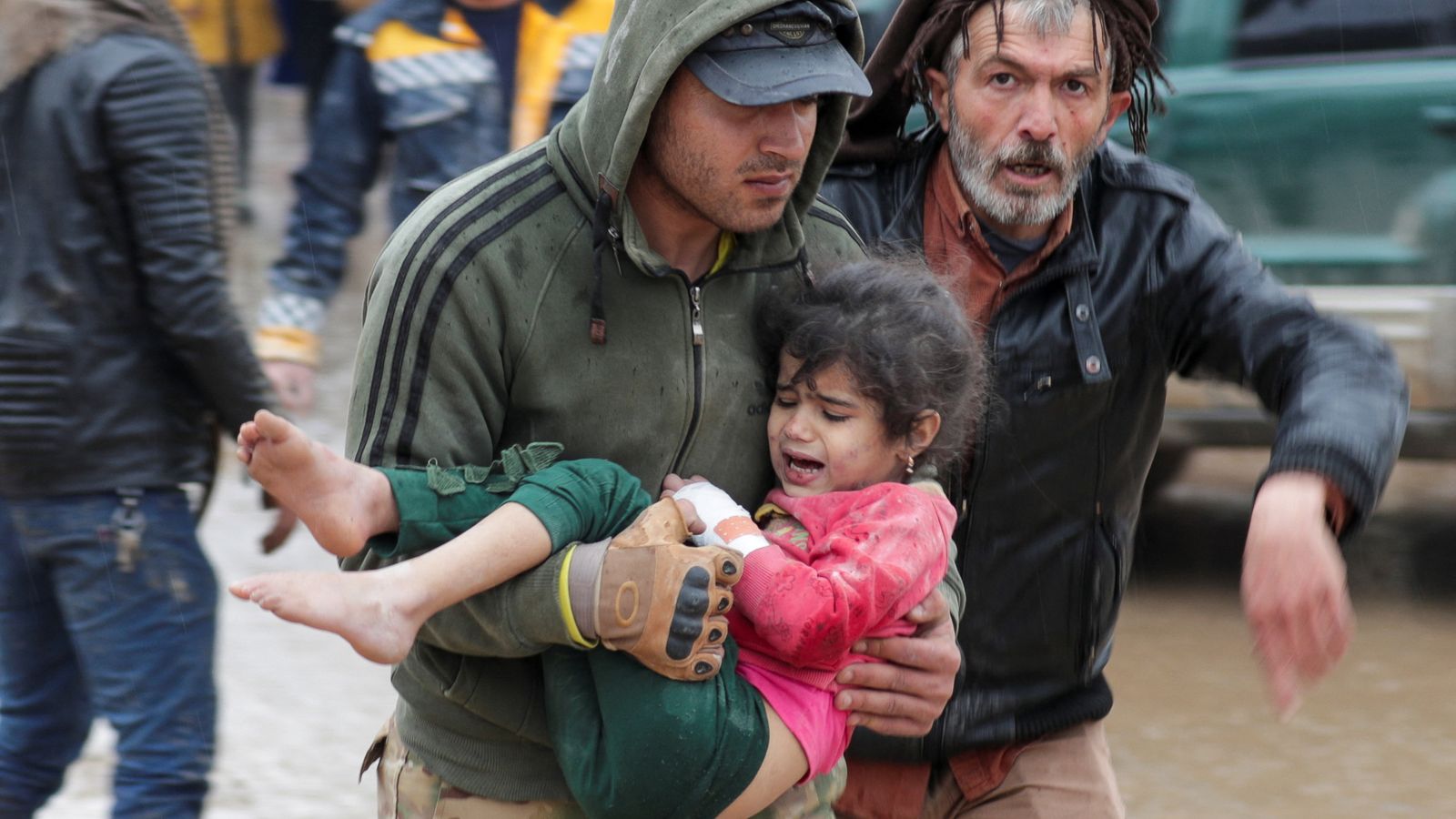 A man carries a girl following the earthquake in Jandaris, Syria. Image source.