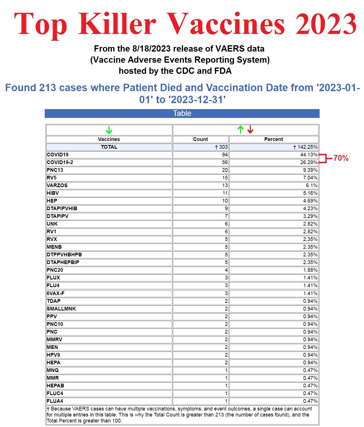 As of the latest data released by the government-funded VAERS (Vaccine Adverse Events Reporting System) at the time of this writing, the COVID shots have accounted for 70% of recorded deaths following vaccinations, and 48% of all the cases of injuries recorded from all vaccines COMBINED currently being administered.