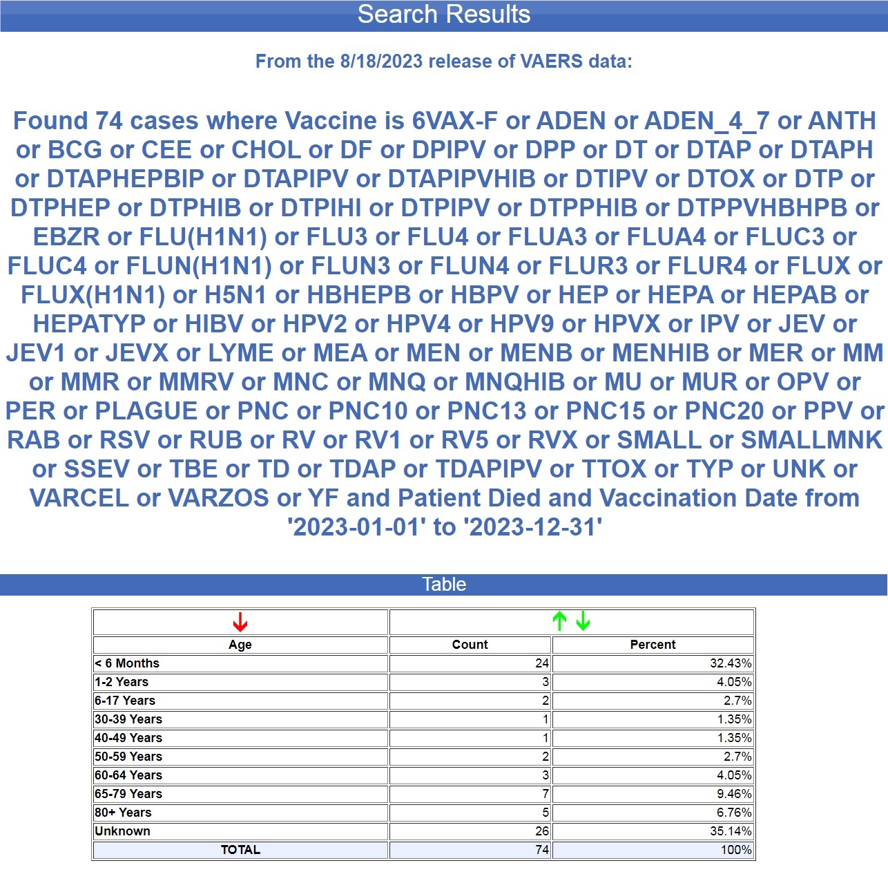 Here is the age breakdown of all the non-COVID vaccines so far here in 2023 that have resulted in deaths. (Source.)