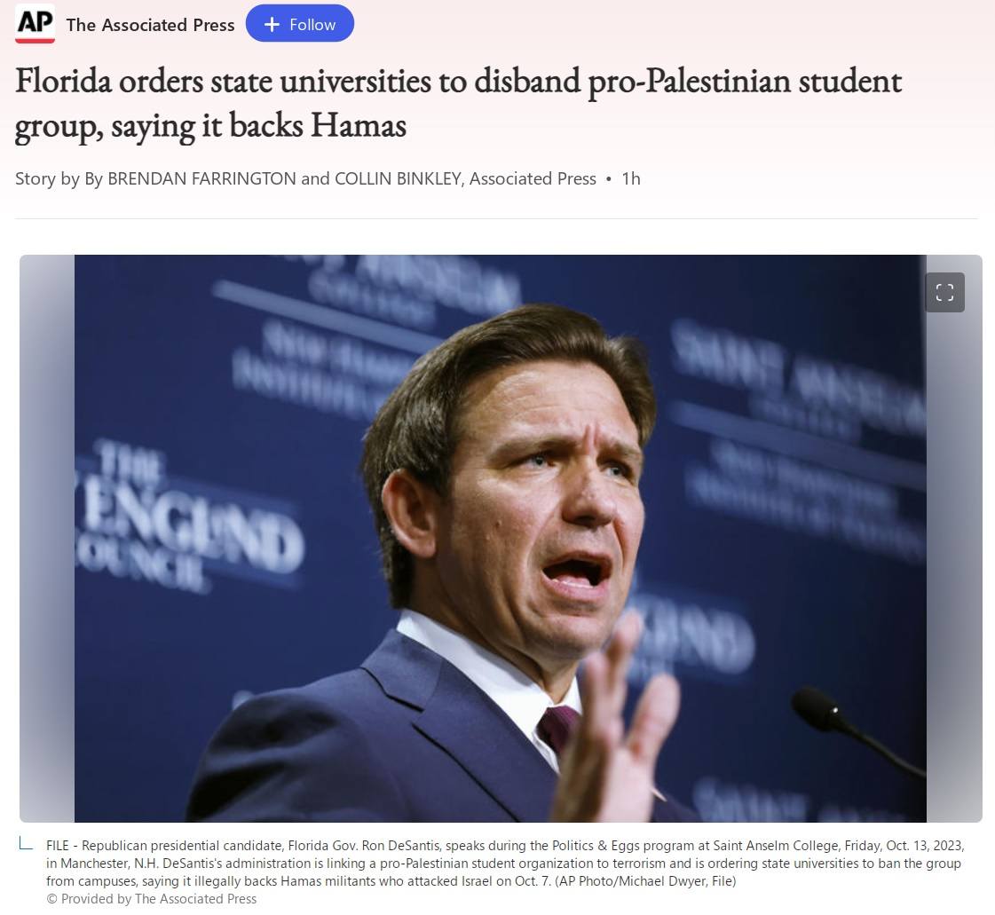 In Florida, college and university students, where freedom of speech should be welcome, are allegedly being forced to disband if they have anything to do with Palestinians that don’t fit in with the Zionist views of Evangelical Christianity.