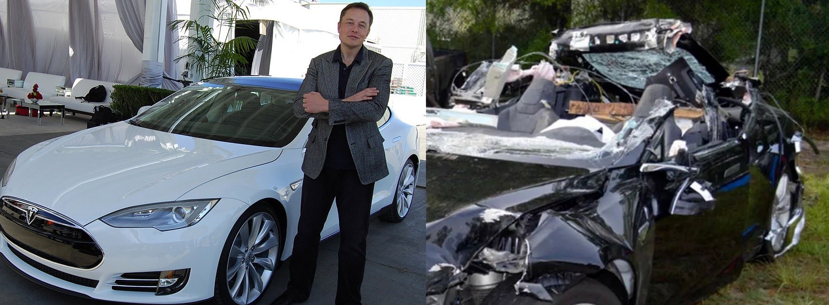 Left: Elon Musk beside a new Tesla car in California. Right: Tesla Model S that crashed in Florida while on self-driving mode killing the driver. (Source.)