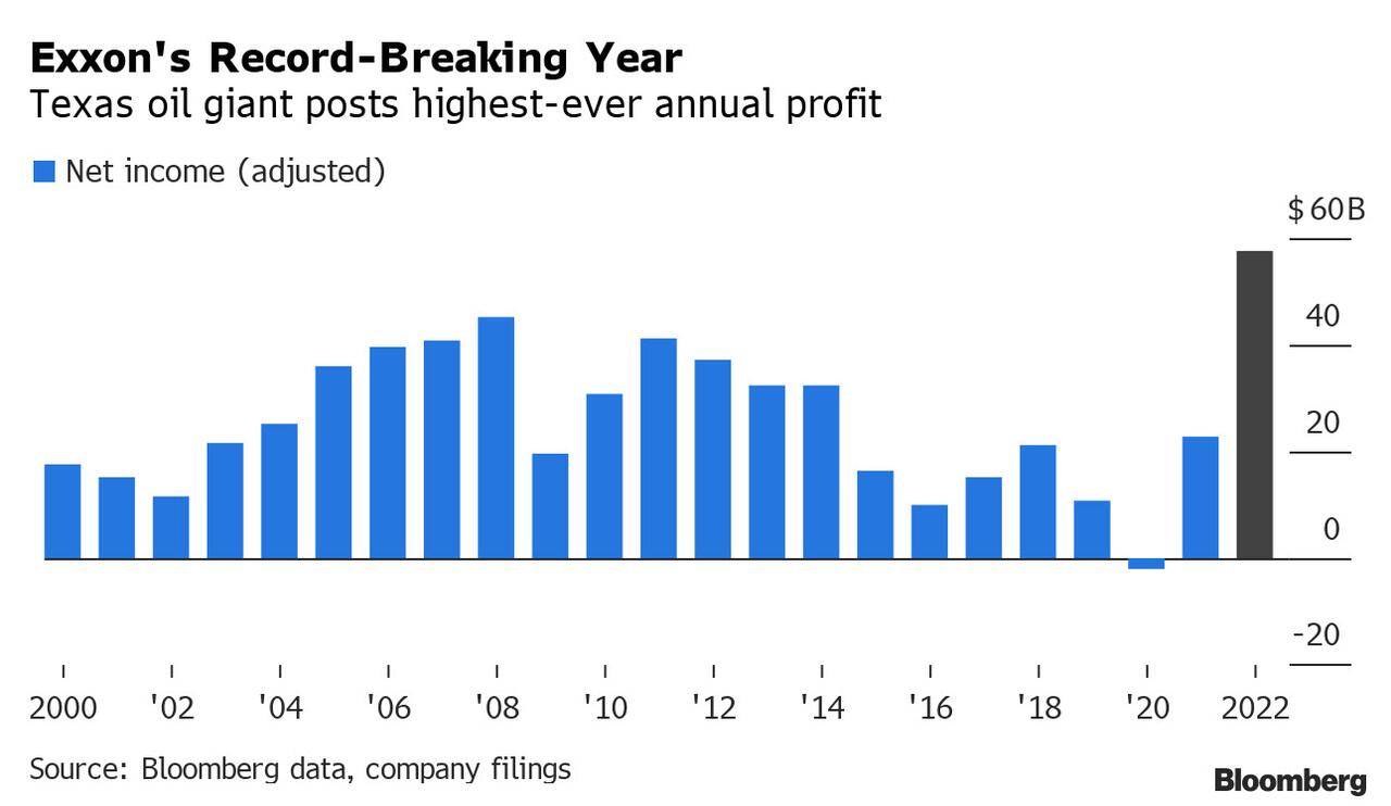 Several days after blowout earnings by its biggest competitor Chevron, this morning US E&P giant Exxon Mobil posted blowout Q4 and full year numbers, when it reported $59 billion in adjusted profit for 2022, taking home more than $6.7 million per hour last year, and setting not only a company record but a historic high for the Western oil industry.
