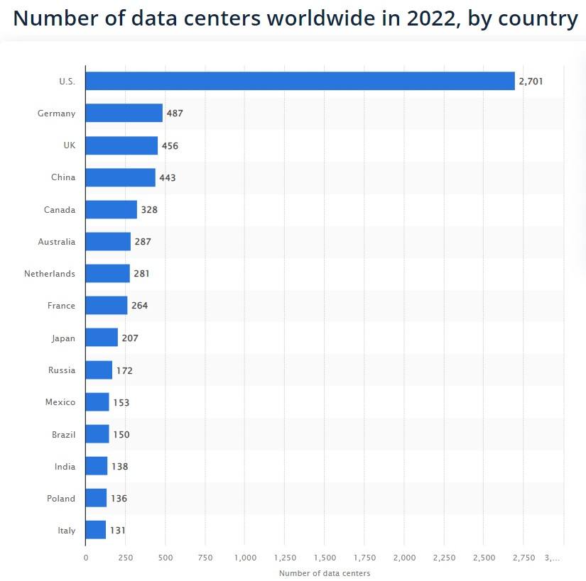 In this category, the U.S. has no serious competitors. In fact, the U.S. owns more data centers than almost all other countries of the world combined, according to Statista.com.