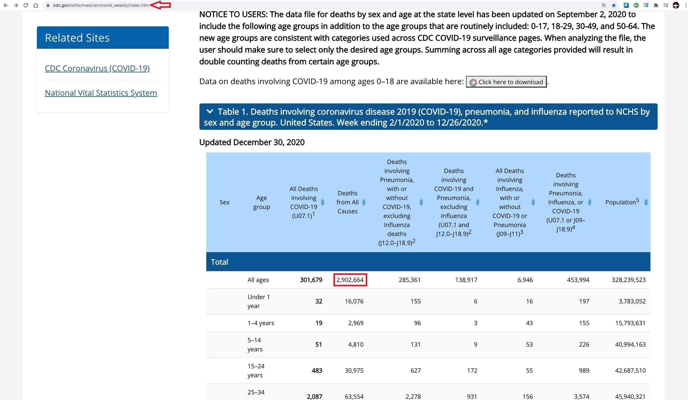 On February 3, 2021, we published a screenshot of a page that existed on the CDC website on December 30, 2020 that showed the total deaths in the U.S. from all causes as of December 30, 2020, as being 2,902,664 deaths. See: