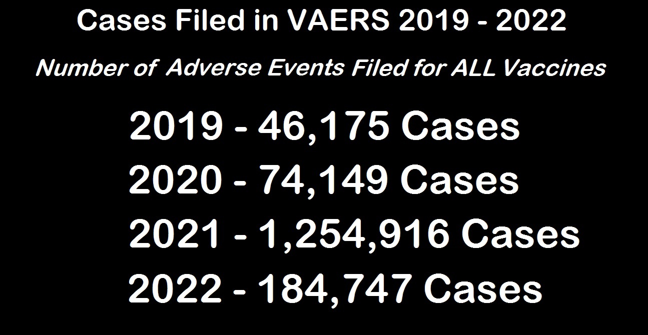By the end of 2021, the number of adverse events filed in VAERS had exploded to over 1.2 million, a 2,618% increase over 2019, the last year before the COVID-19 shots started.