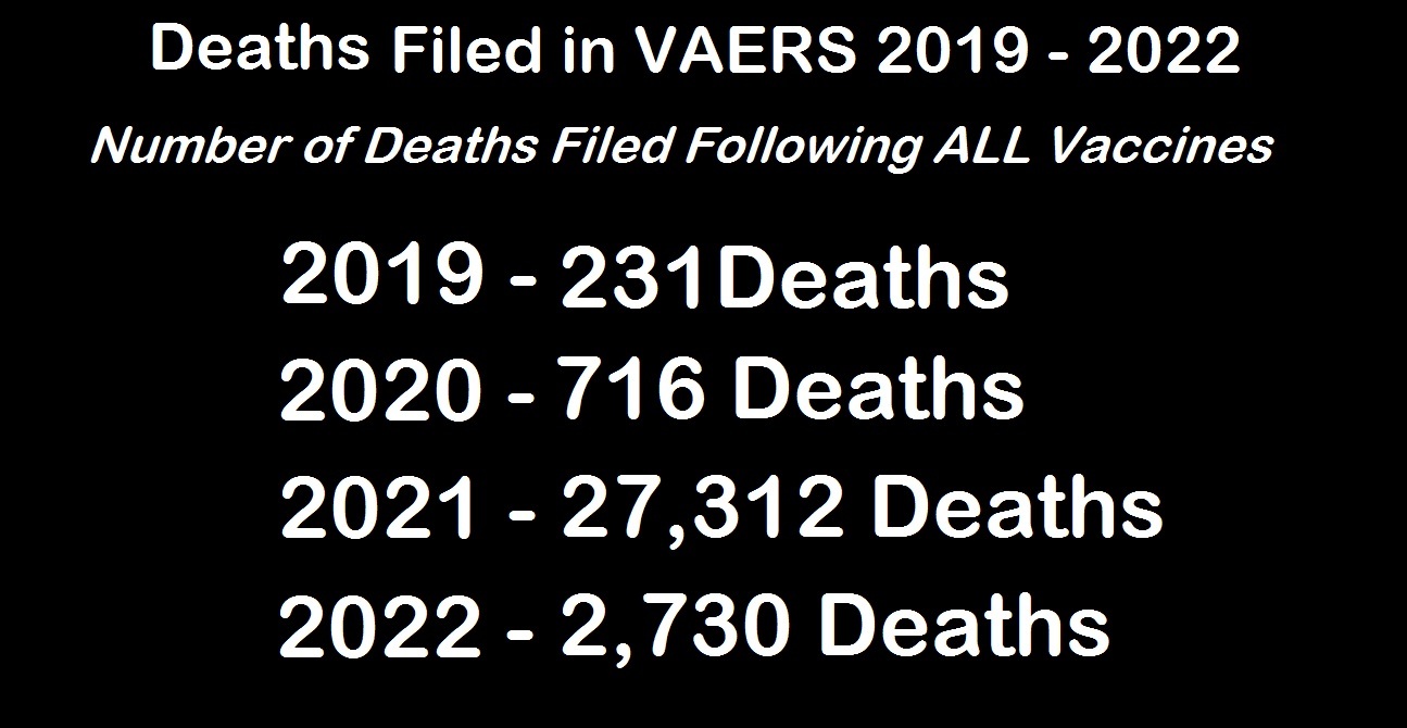 Next, let’s look at the number of deaths that were reported to VAERS following the injection of vaccines during the four year period between 2019 through 2022.