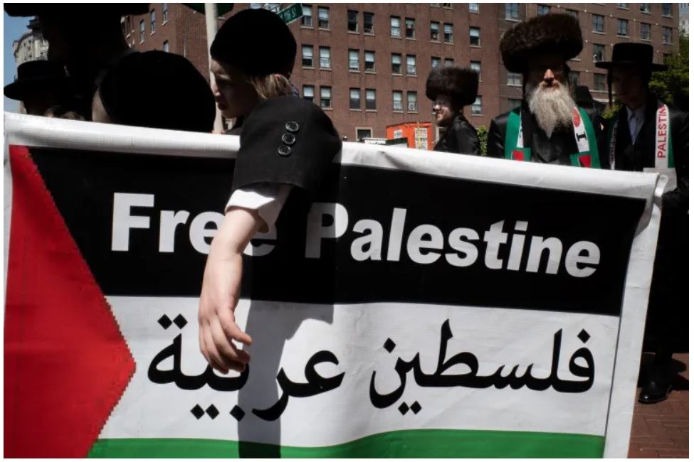 Members of the Orthodox Jewish community advocate for a free Palestine at the gates of Columbia University in New York City. Source.