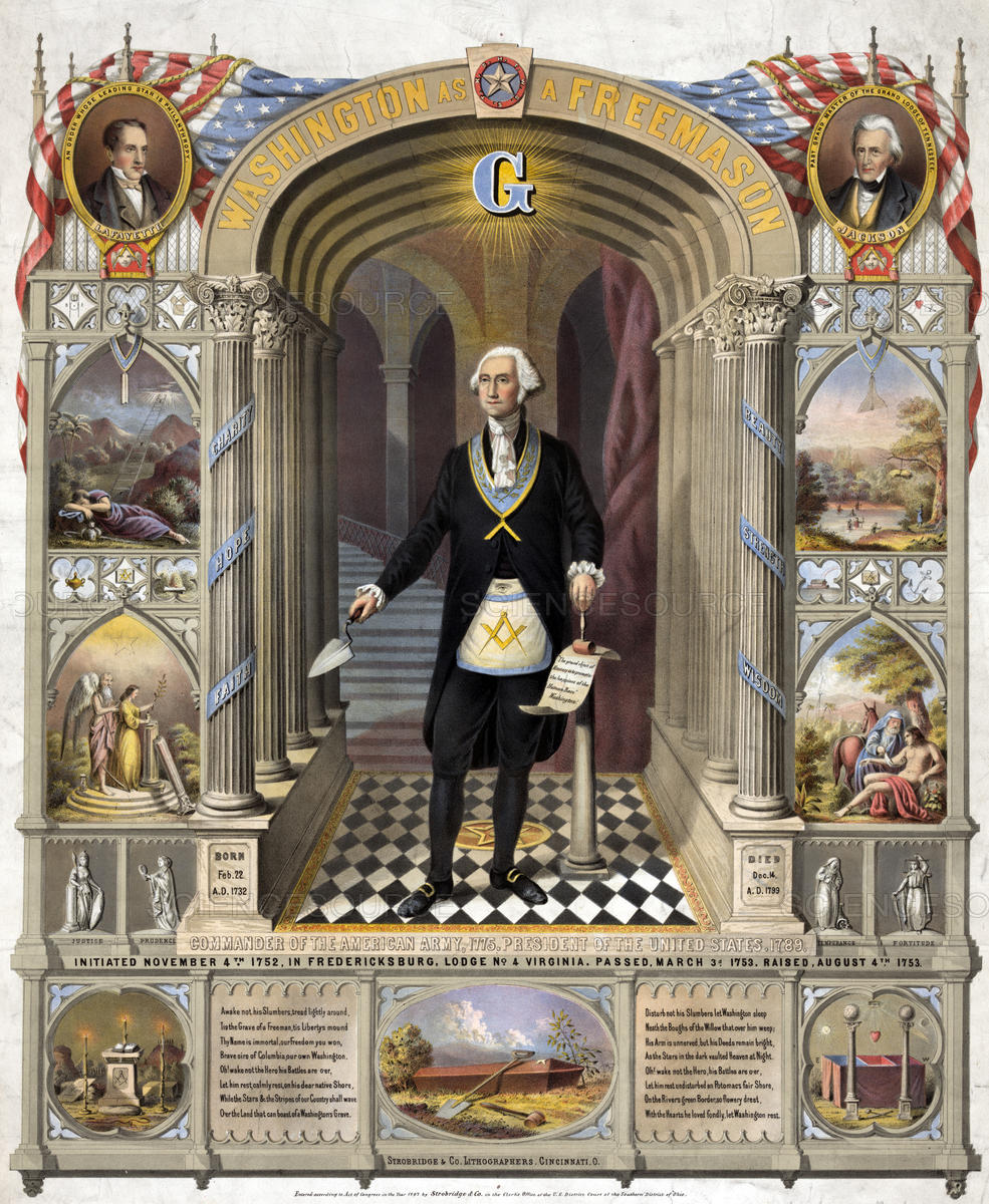 George Washington was a 33 degree Freemason (the highest order.) In this image, Washington is shown in his masonic attire, holding scroll, and trowel. Portraits of Lafayette and Jackson are in the corners. He joined the Masonic Lodge in Fredericksburg, Virginia at the age of 20 in 1752. At his first inauguration in 1791, President Washington took his oath of office on a Bible from St. John’s Masonic Lodge in New York. In retirement, Washington became charter Master of the newly chartered Alexandria Masonic Lodge No. 22, sat for a portrait in his Masonic regalia, and in death, was buried with Masonic honors. This image is in many places on the Internet. I copied this one from Sciencesource.com.