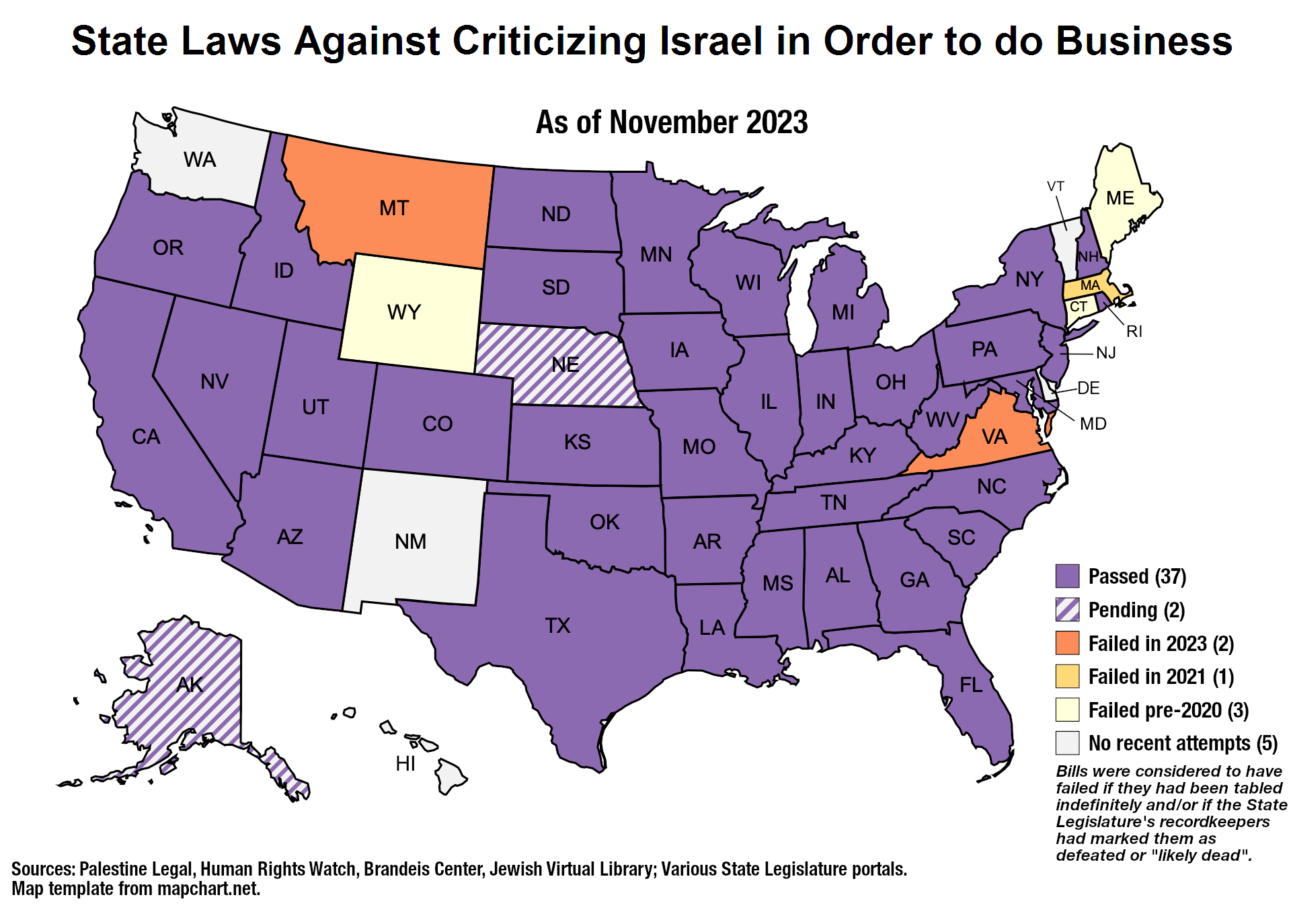 To date, 38 states have adopted laws, executive orders, or resolutions designed to discourage boycotts against Israel.