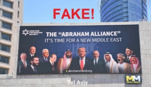 Billboard that rapidly appeared in Tel Aviv one day after ceasefire. Most of the men shown here are NOT members of the Abraham Accord. Source [1].